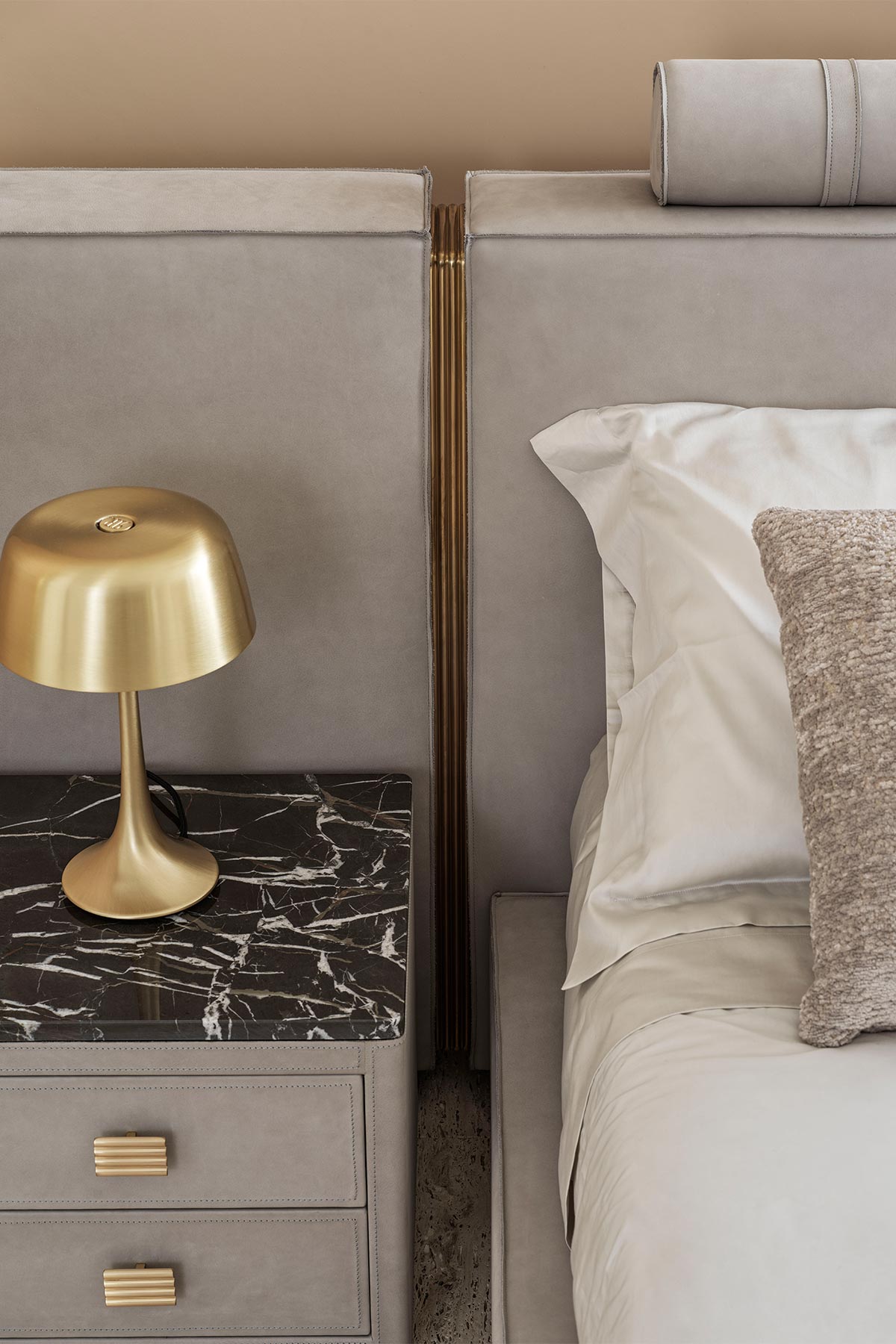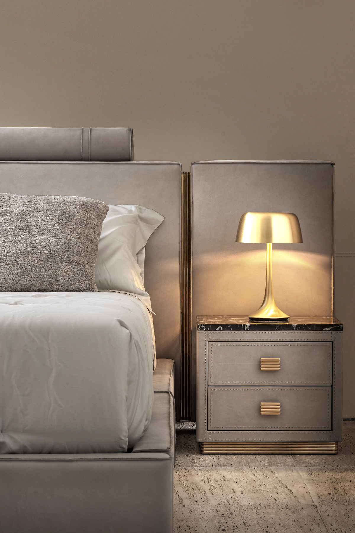 Padded and upholstered headboard featuring metal details that contrast with the leather and create a visually appealing design.