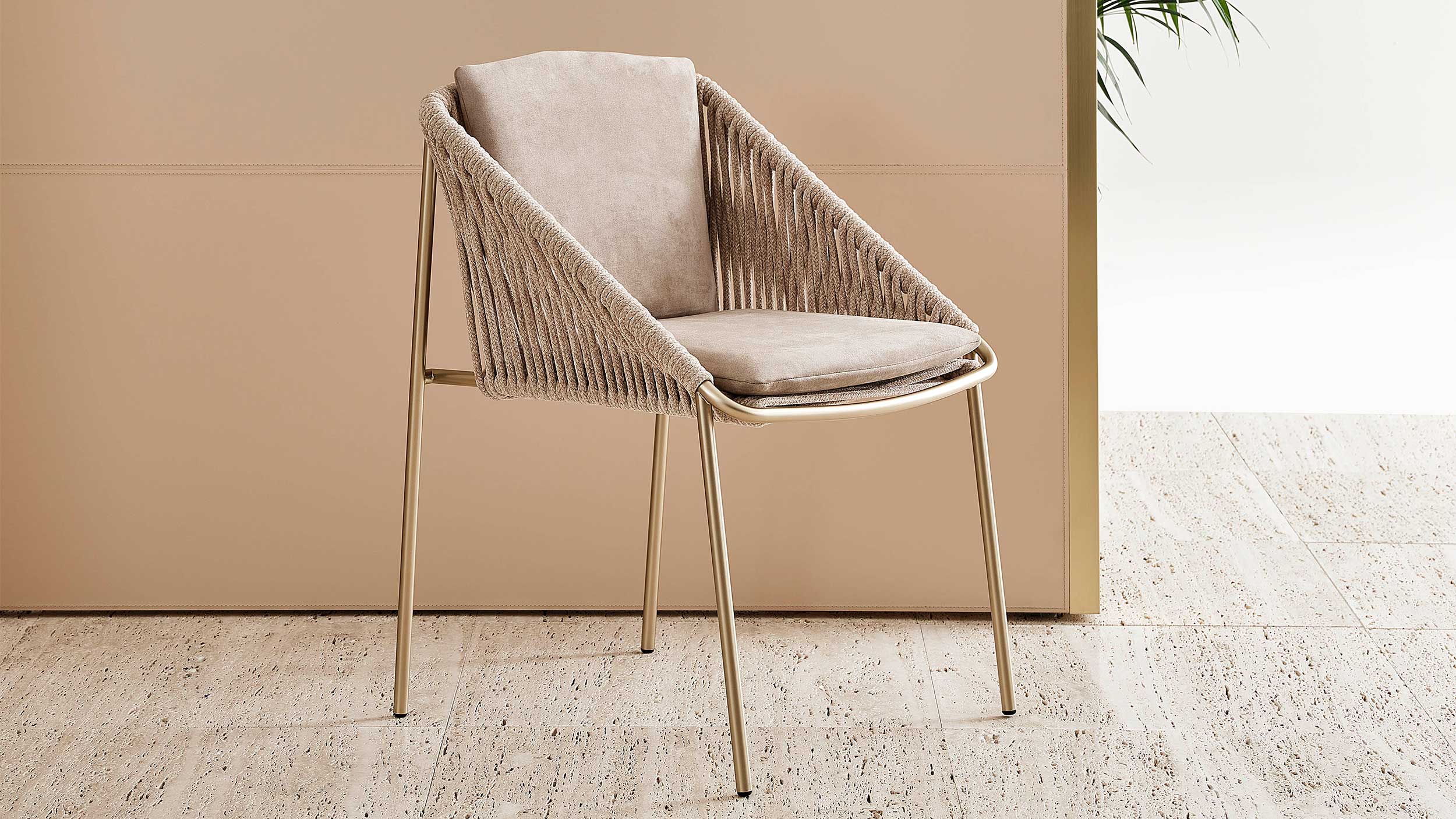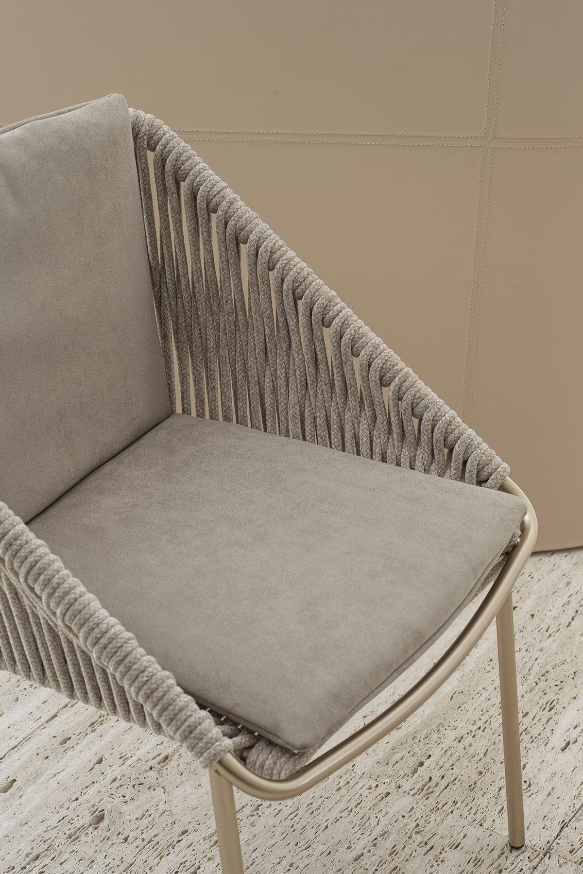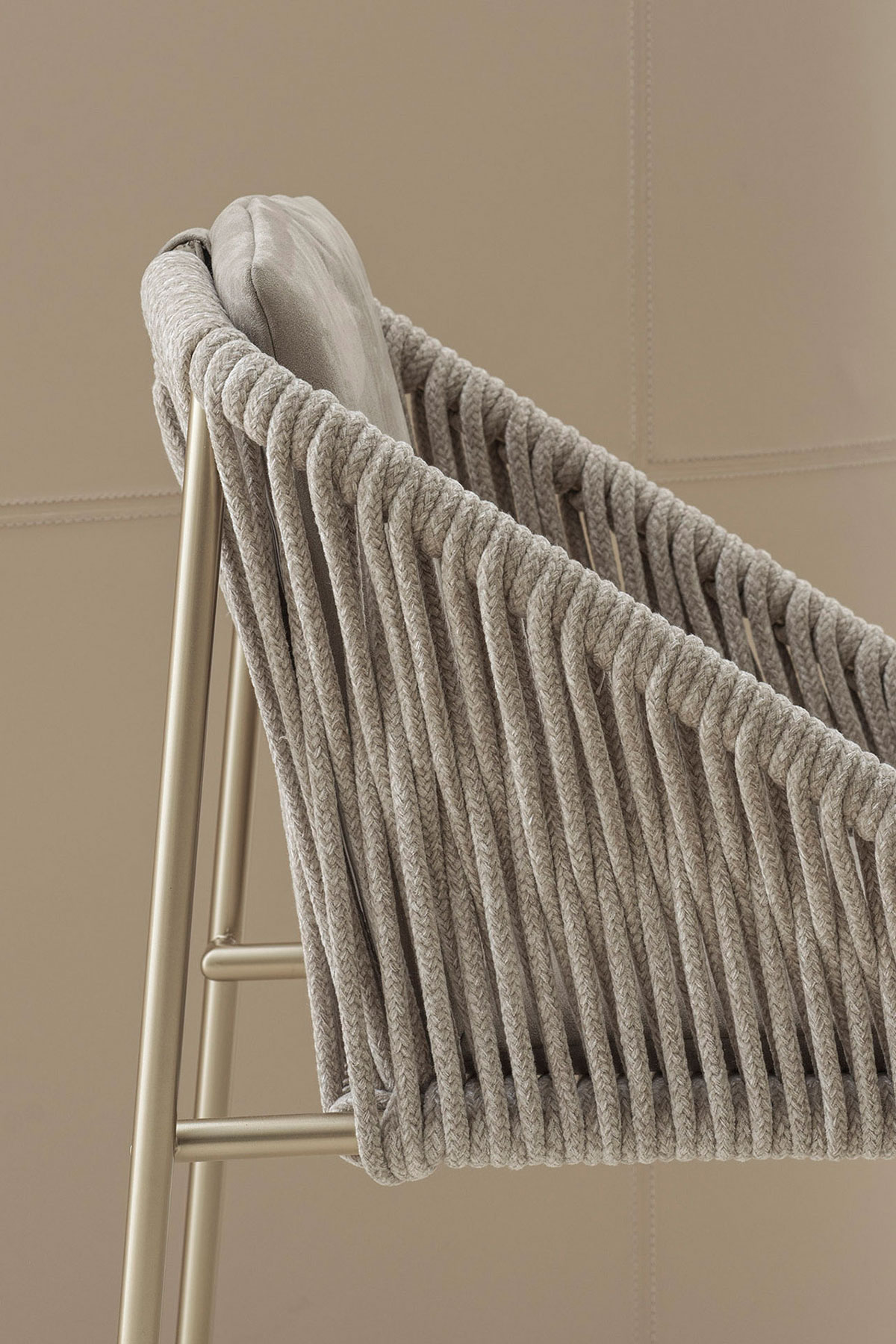 Range of seating elements featuring velvet rope detailing and cosy cushioning. Available as chair, bench and bar stool.