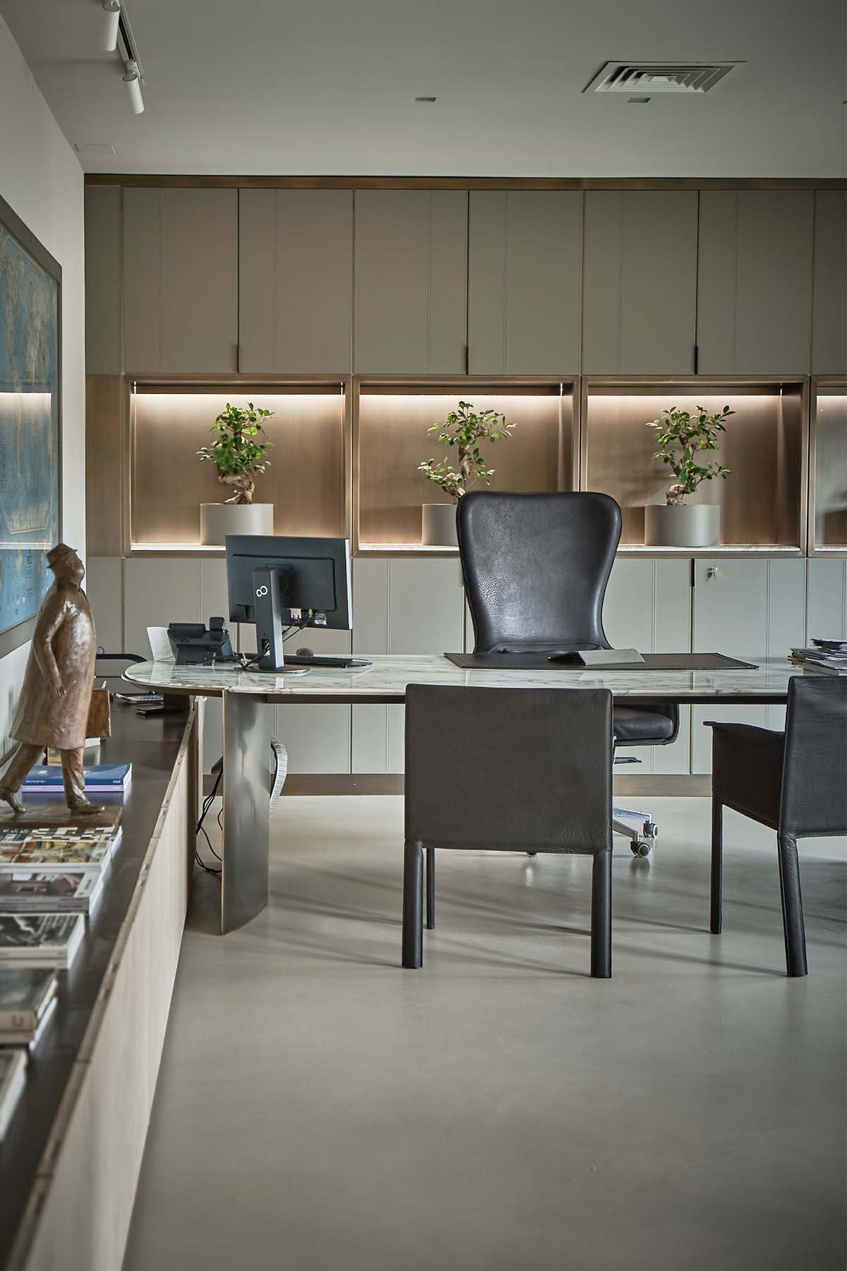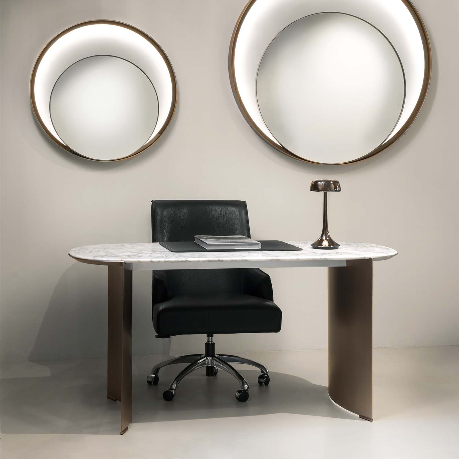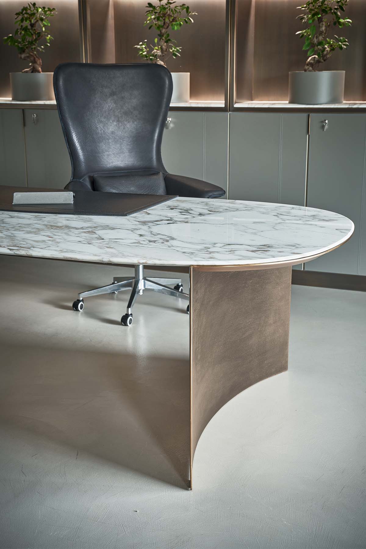 An organic and seductive design embellishes the presidential desk, characterized by the profile under the bronze top set along the perimeter that supports and the top, in marble, wood and de