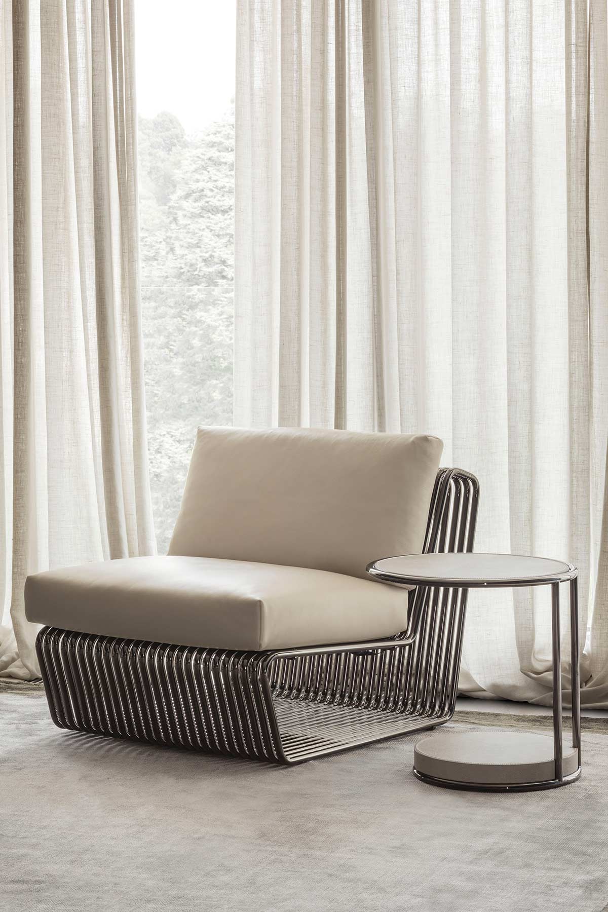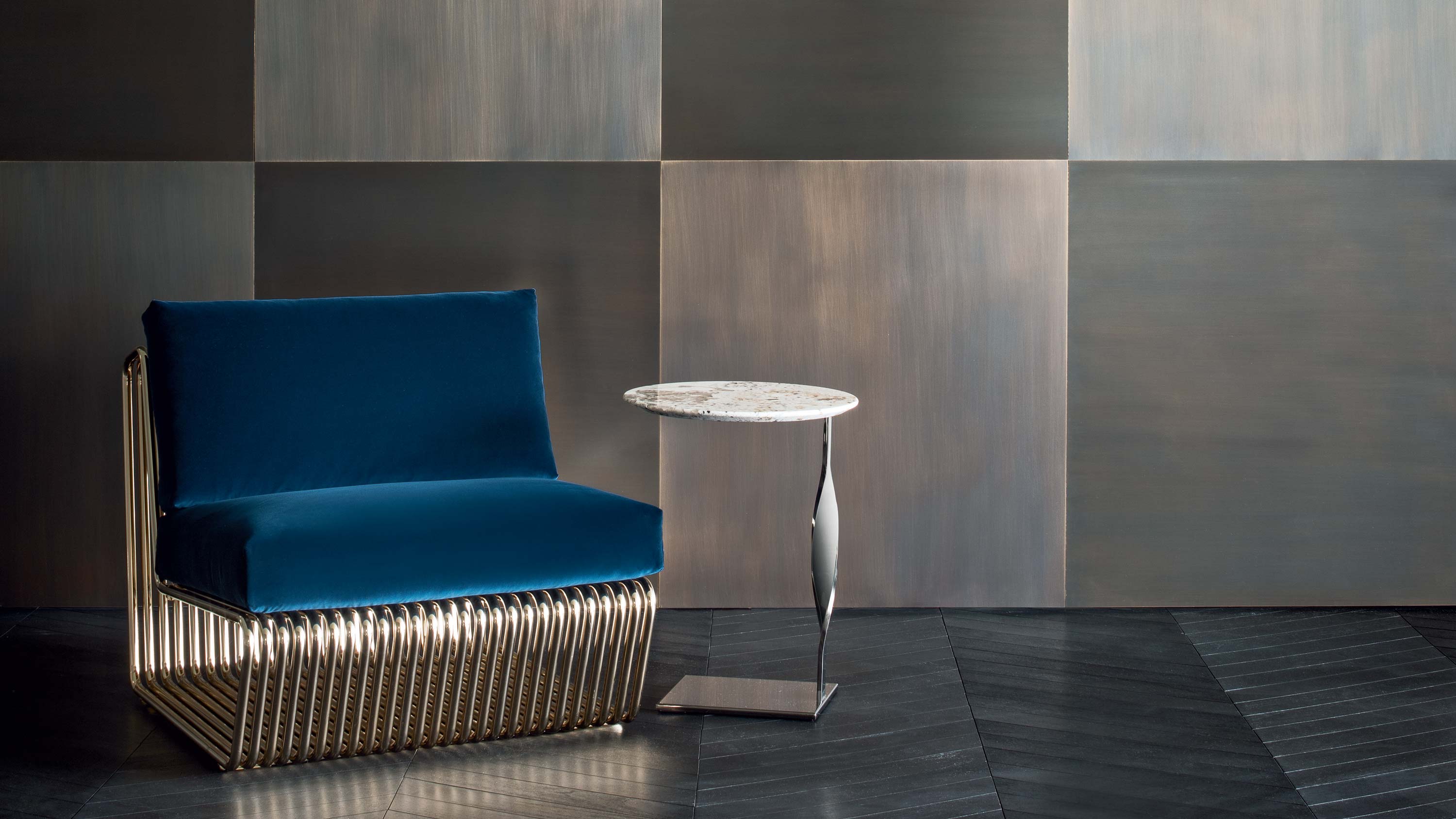 The name identifies the main design trait, a sinuous and continuous shape. The infinity concept is also recurrent in the glossy gold or dark chrome hand-finished components of the structure, which constantly repeat to create an unique, sculptures-like piec