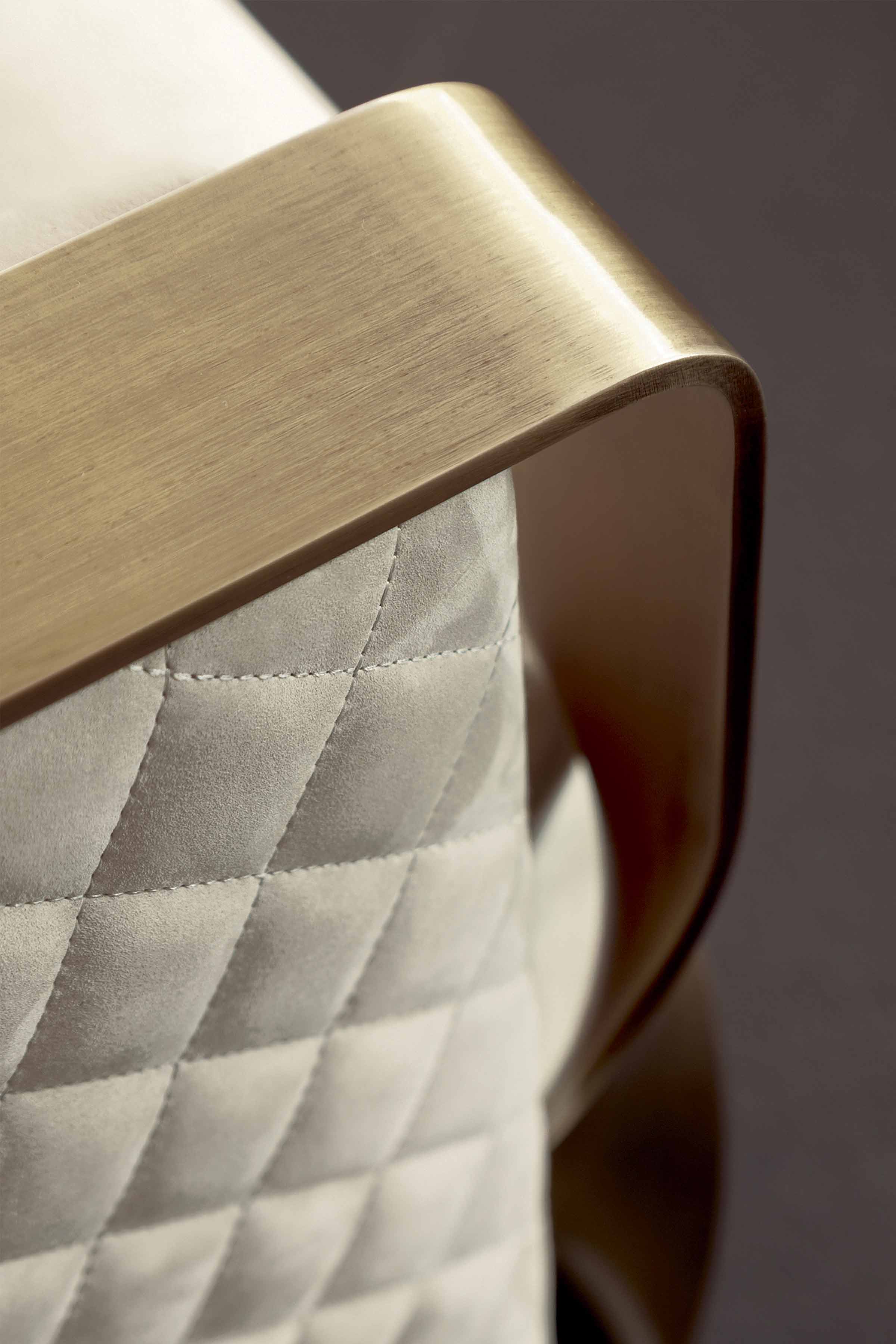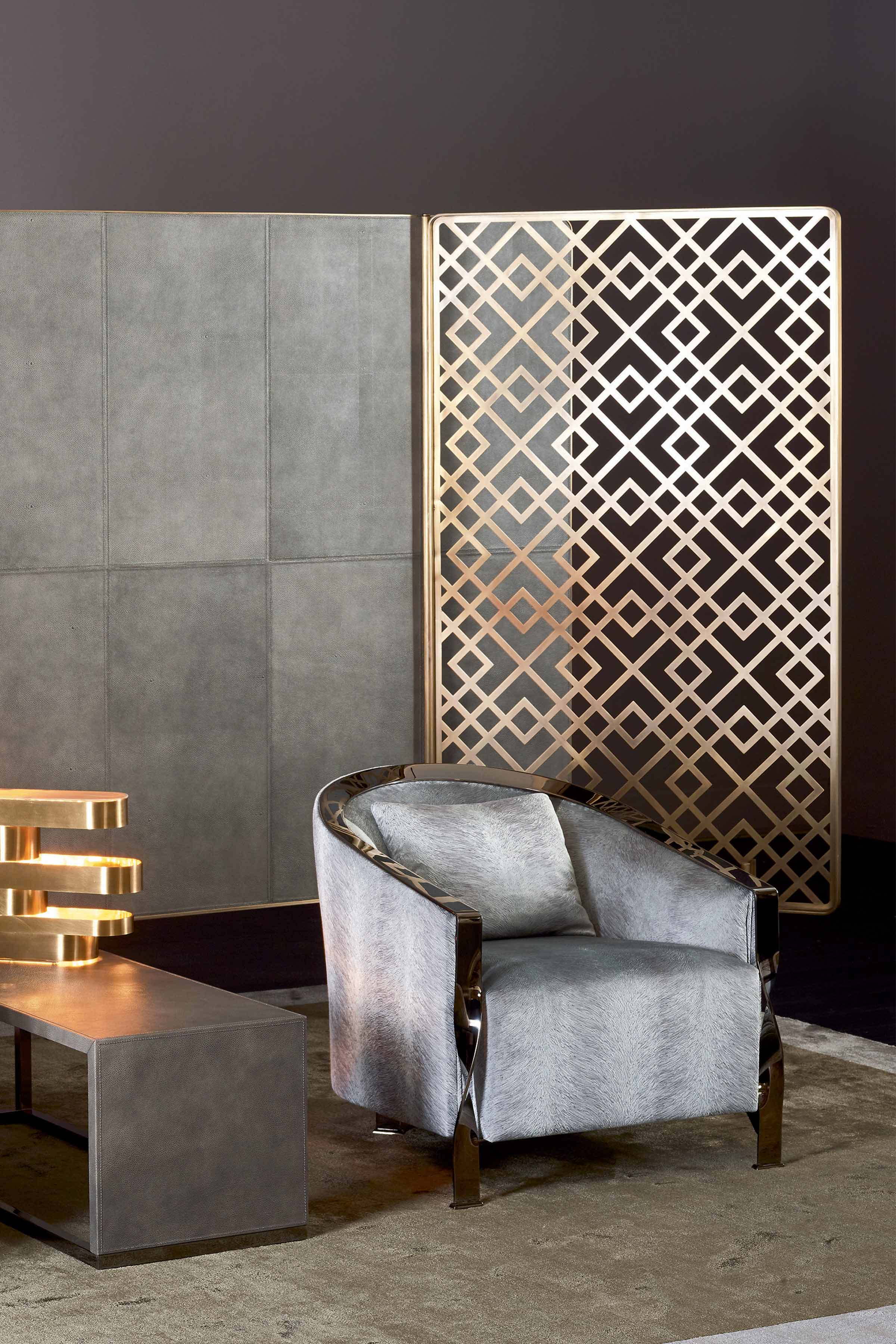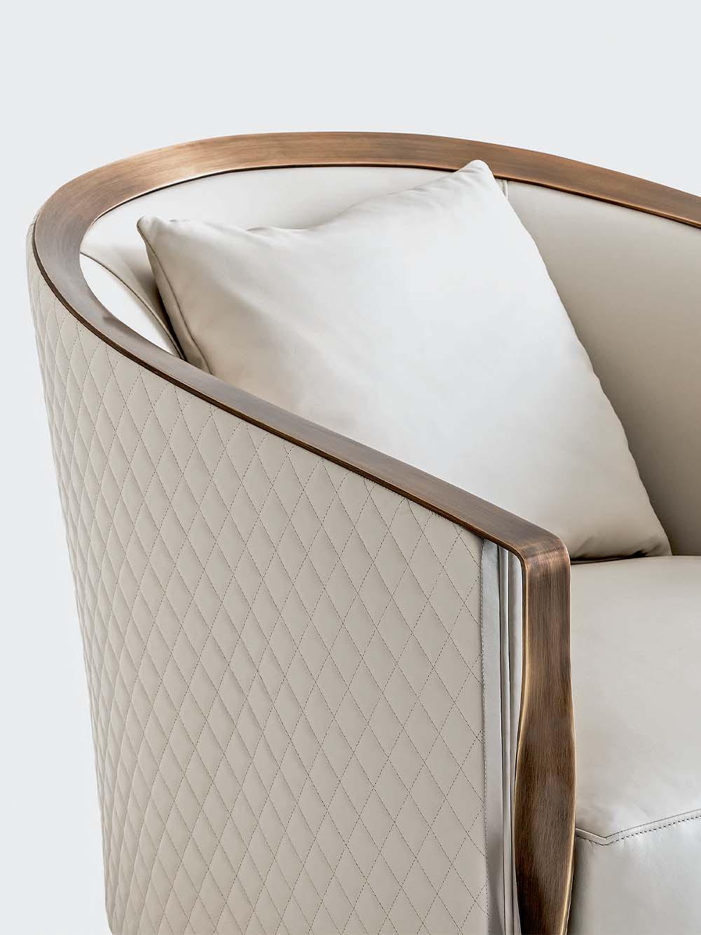 Armchair characterised by its twisted structure, finished in bronze or upholstered. Outer surface available plain or with matelassé pattern.