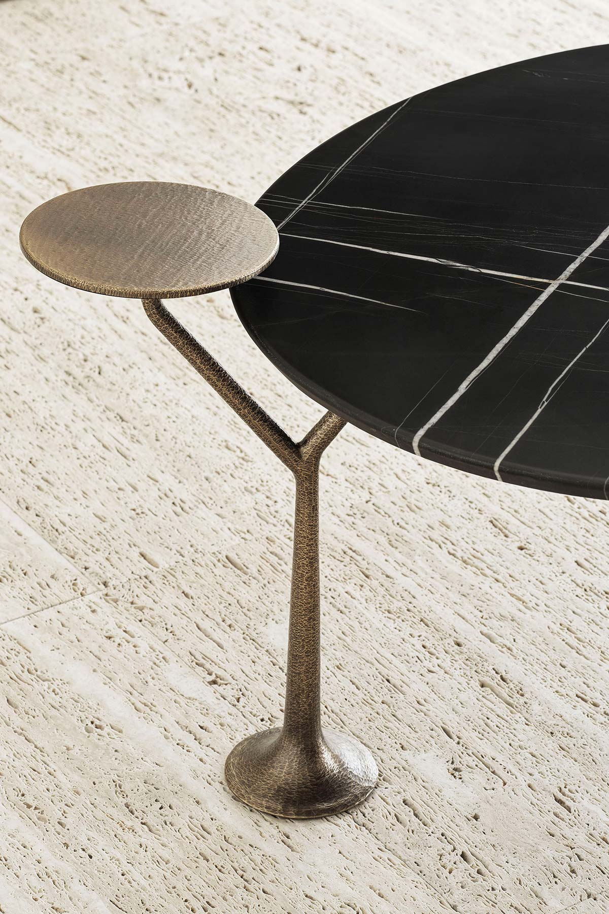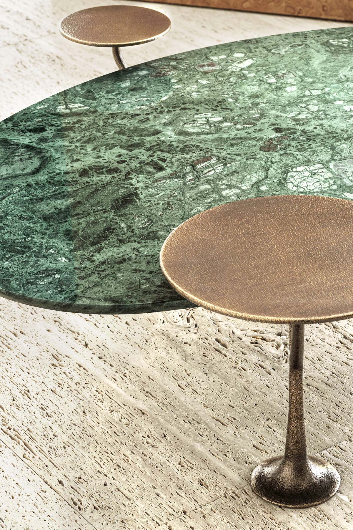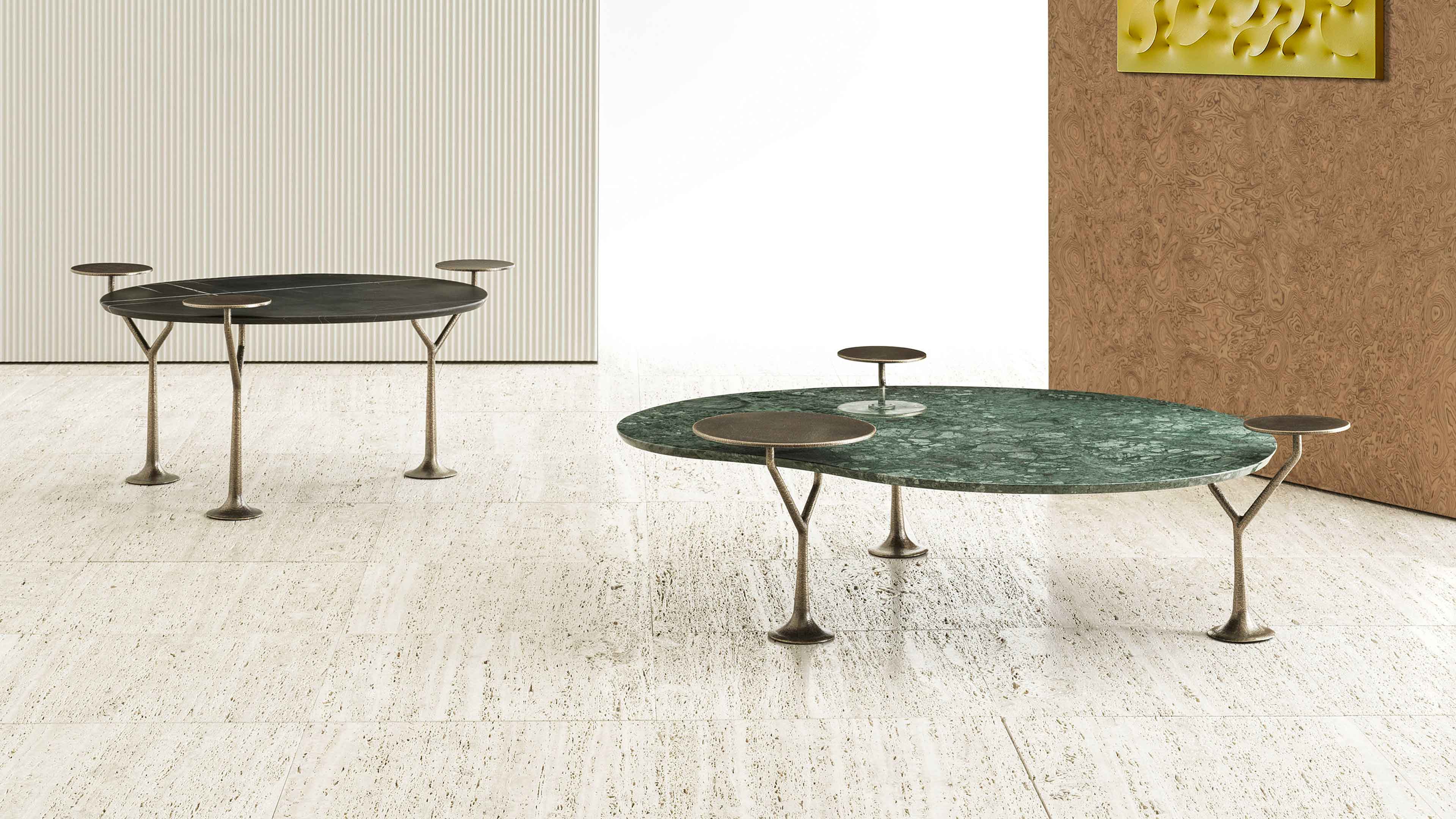 Bonsai is a coffee tables collection with a brass base, characterized by a central leg and two branches that support two top with different size and heights that remind the leaves of a small Bonsai.