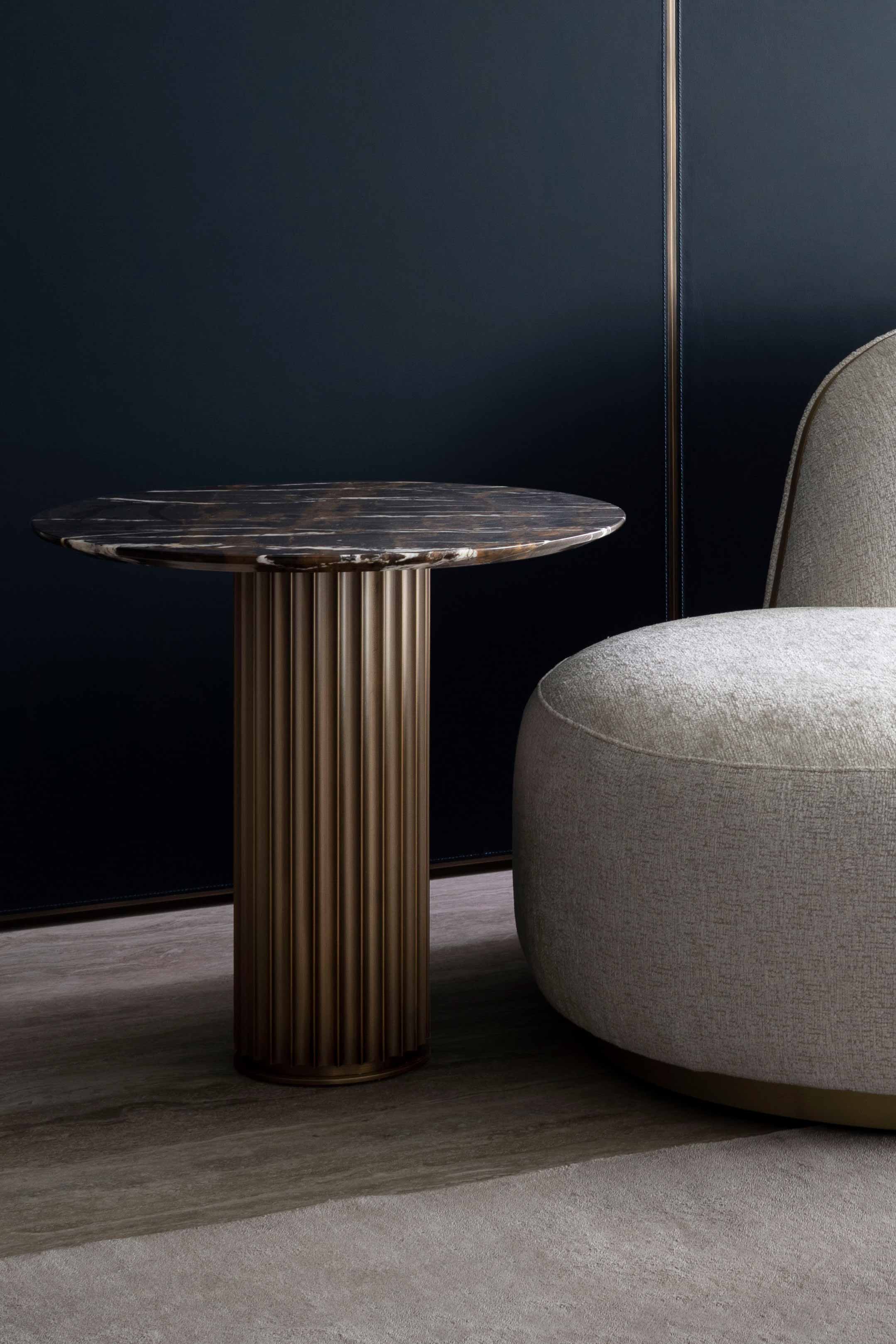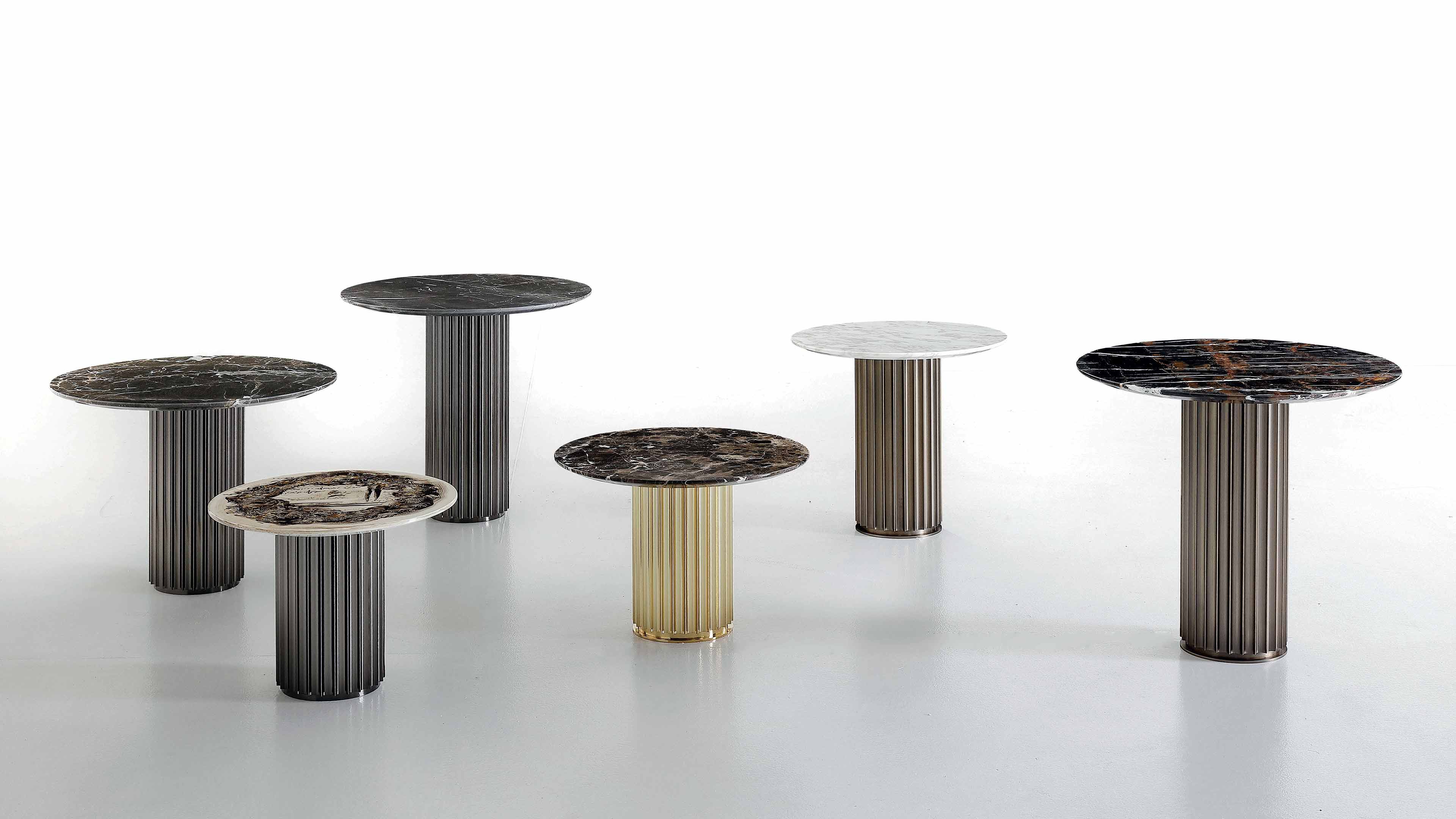 Small table characterised by the column-like base, an aluminium extrusion finished in bronze. Round tops available different sizes.