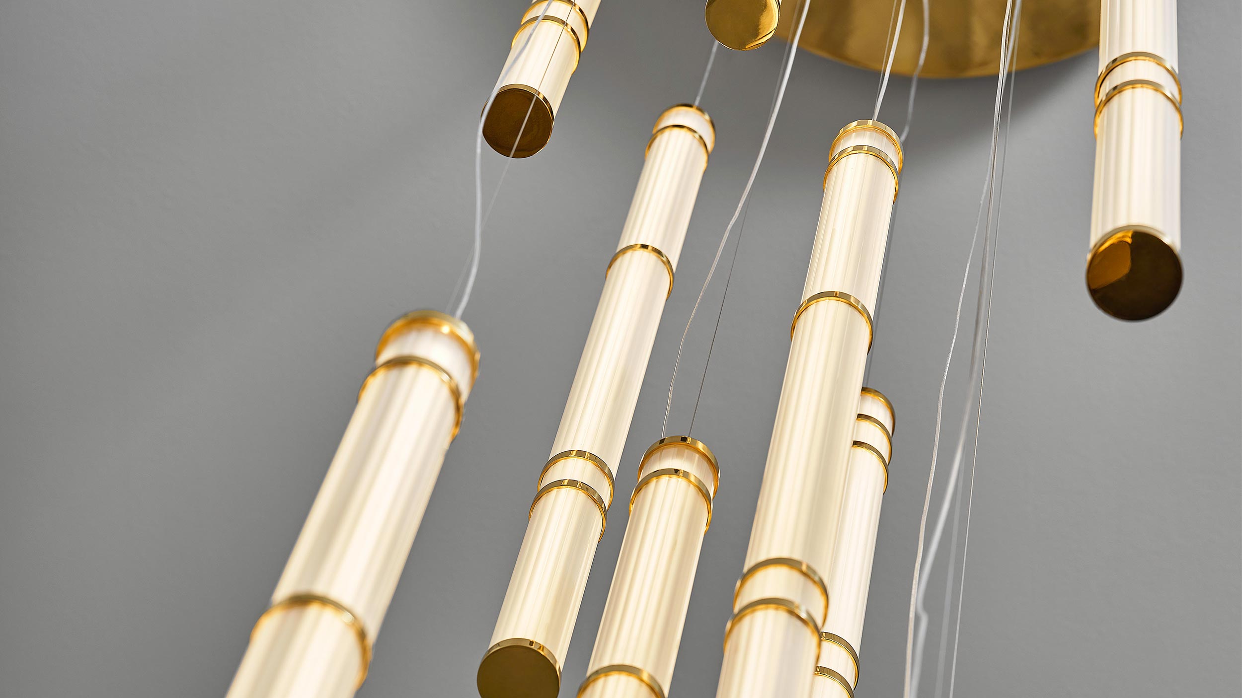 Collection of satin glass lamps with polished brass, single or modular suspensions. Linear shapes harmoniously combined.