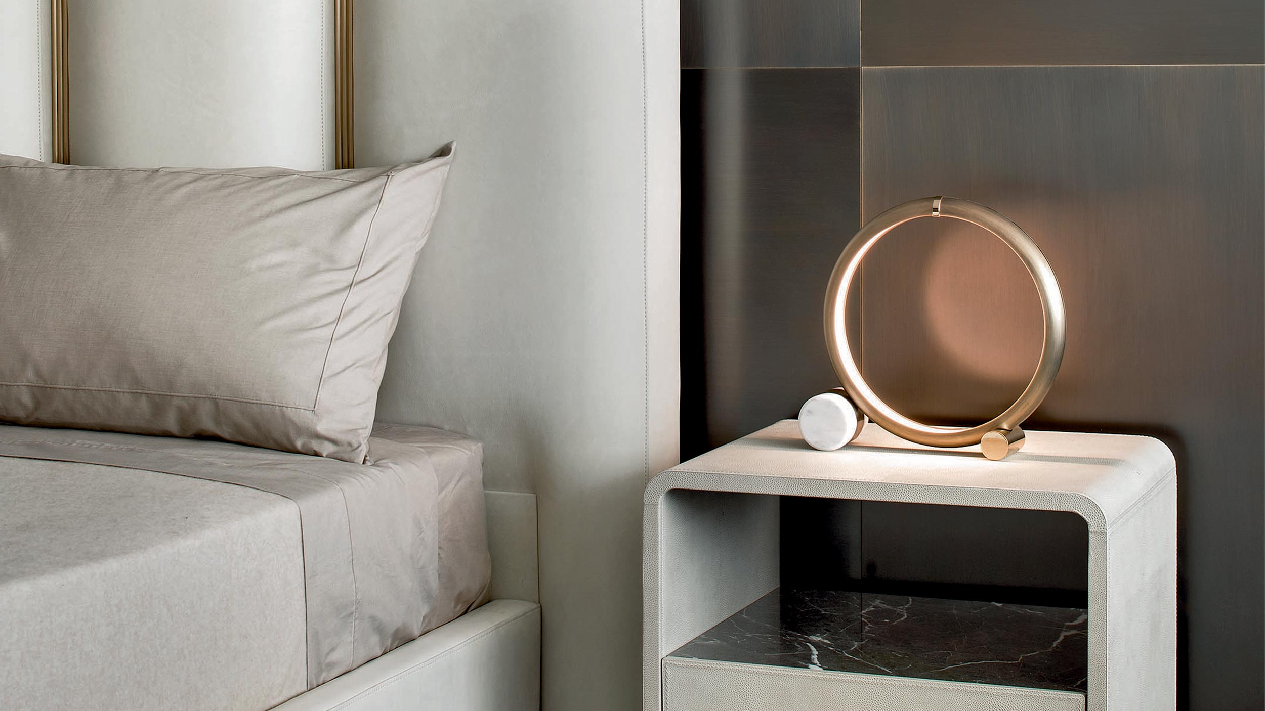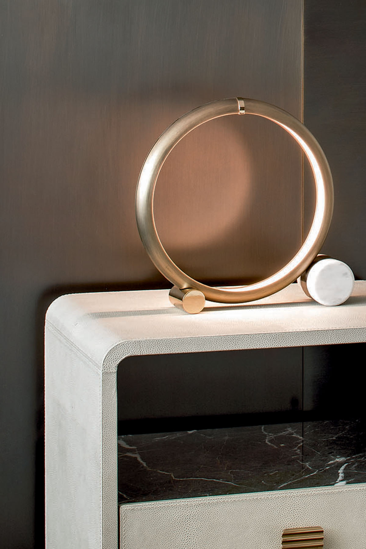 Range of bronze lamps with glossy gold details, also including wall and table lamp. The rings can be used individually or to create harmonious compositions.