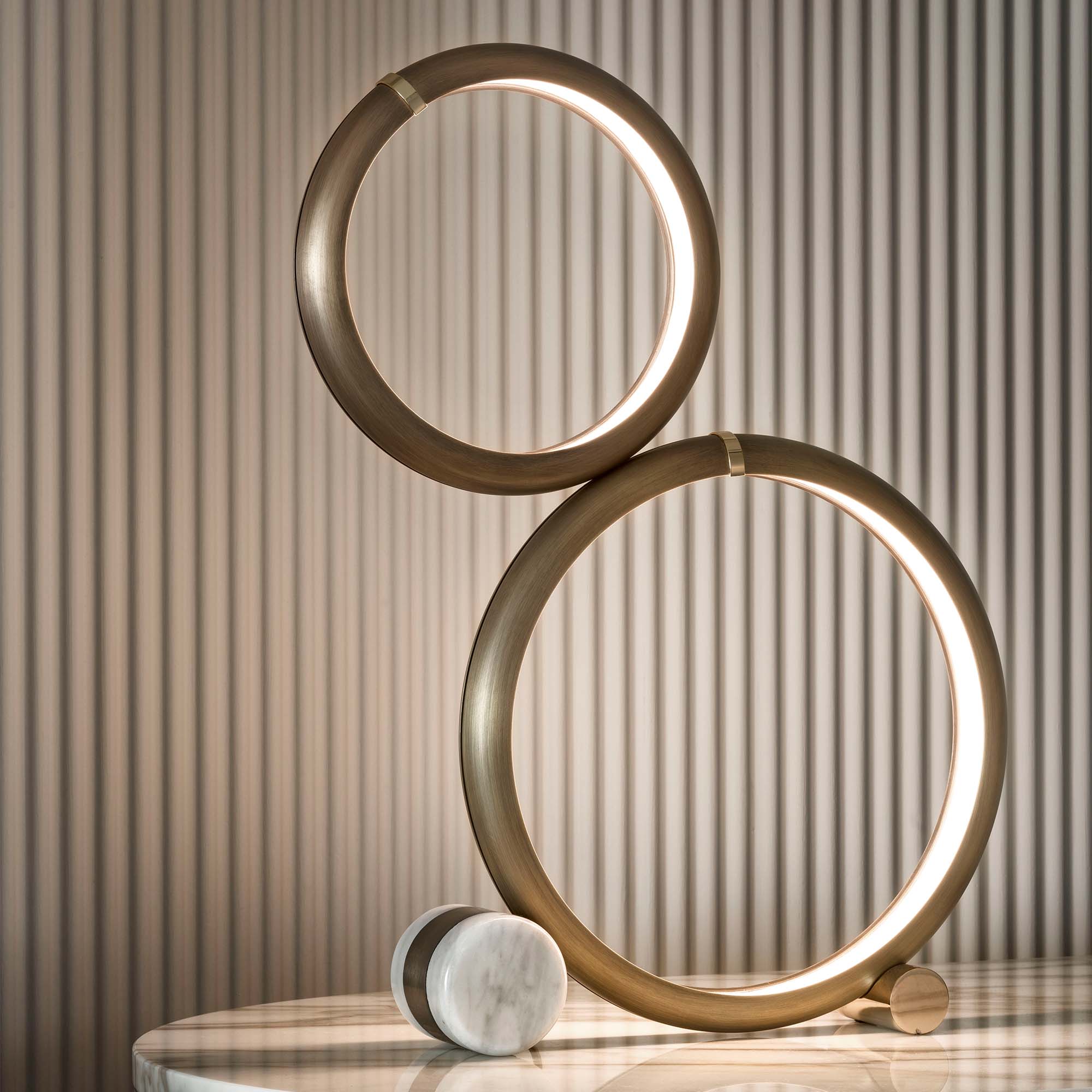 Range of bronze lamps with glossy gold details, also including wall and table lamp. The rings can be used individually or to create harmonious compositions.