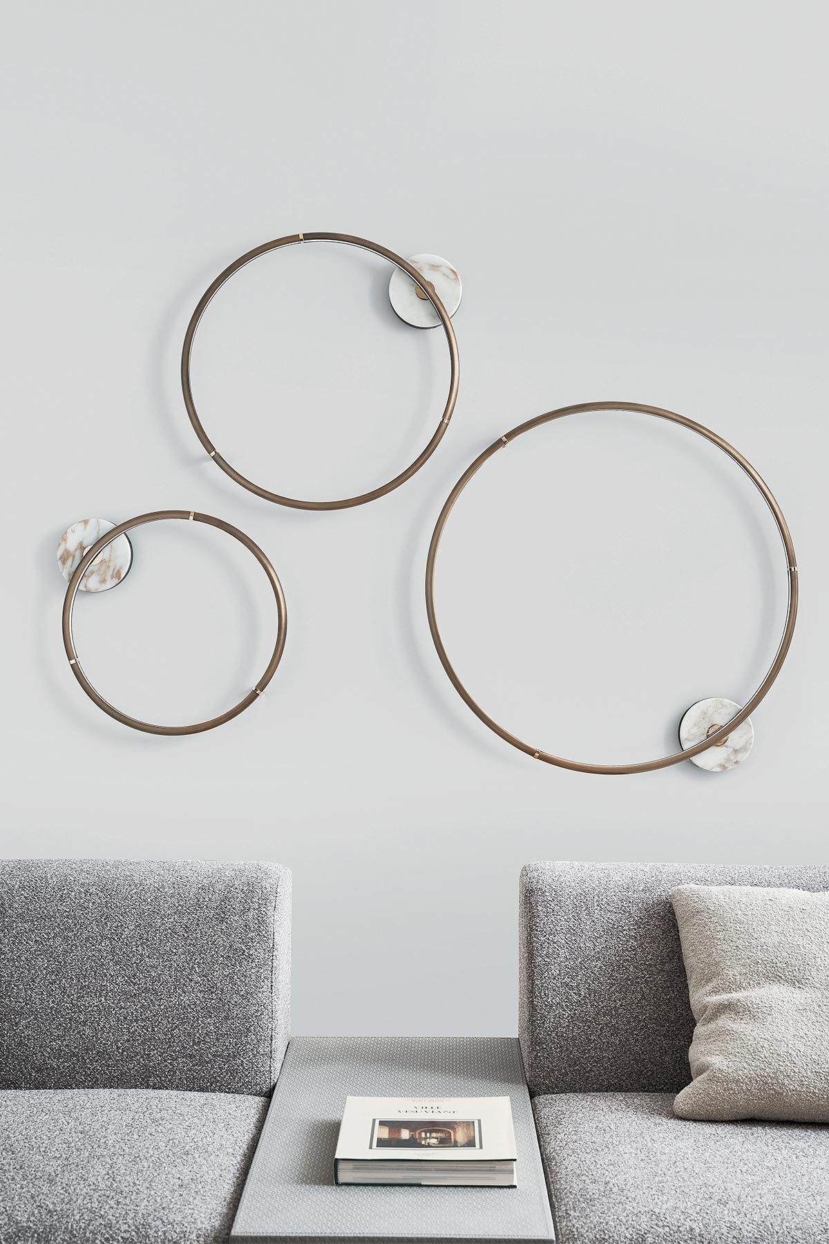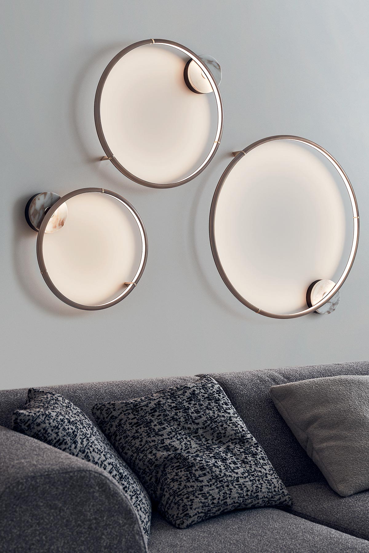 Range of bronze lamps with glossy gold details, also including wall and table lamp. The rings can be used individually or to create harmonious compositions.
