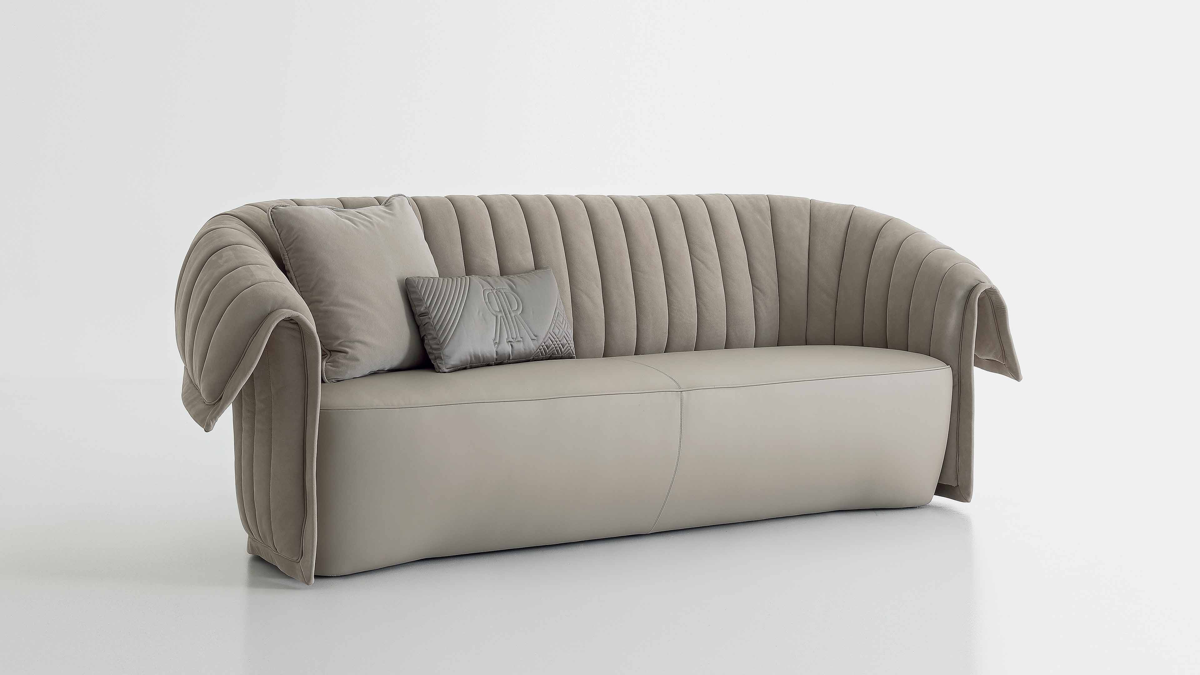 Range of completely upholstered furniture characterised by a soft and sinuous backrest, enriched by stitching, that creates and extremely comfortable and welcoming seat.