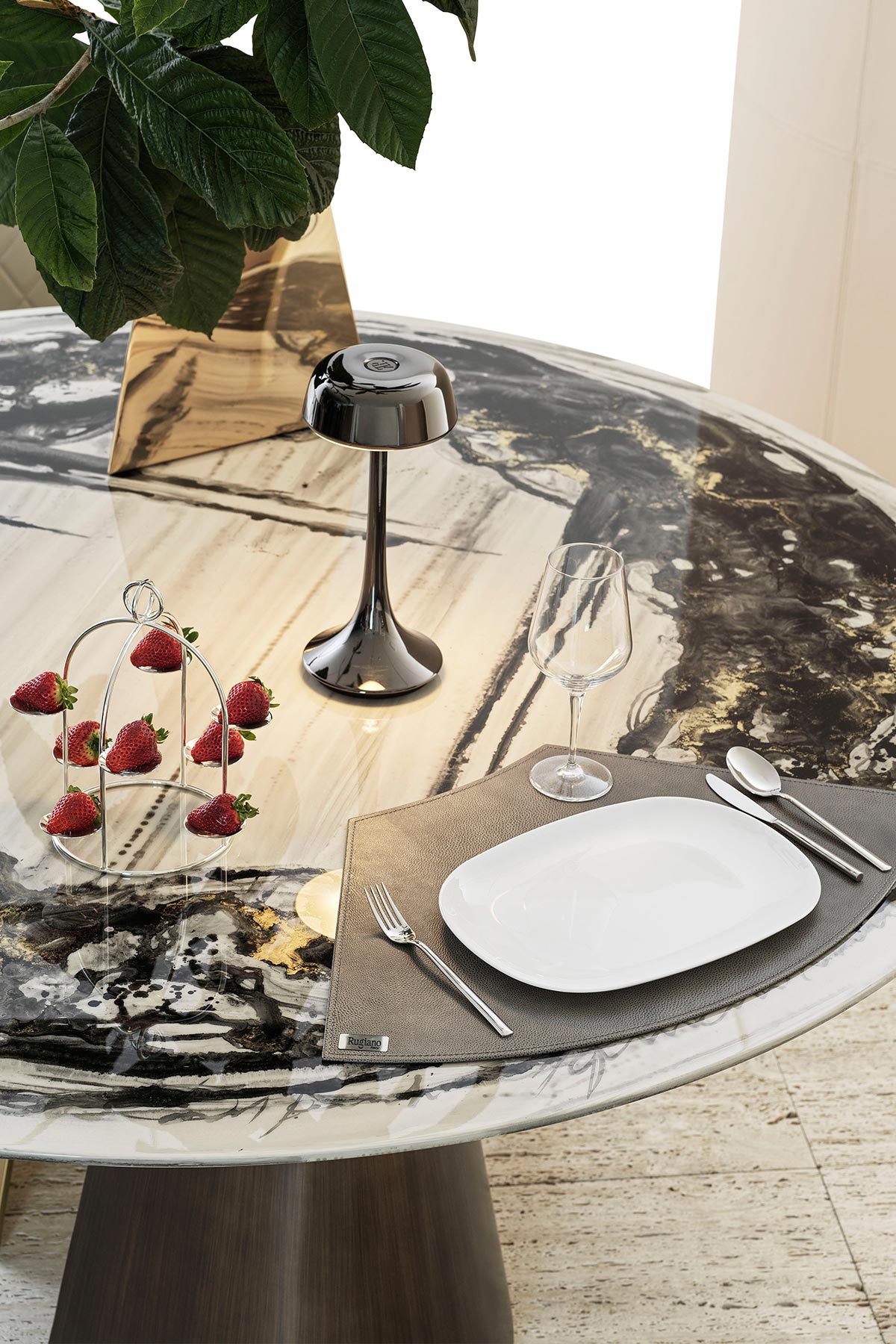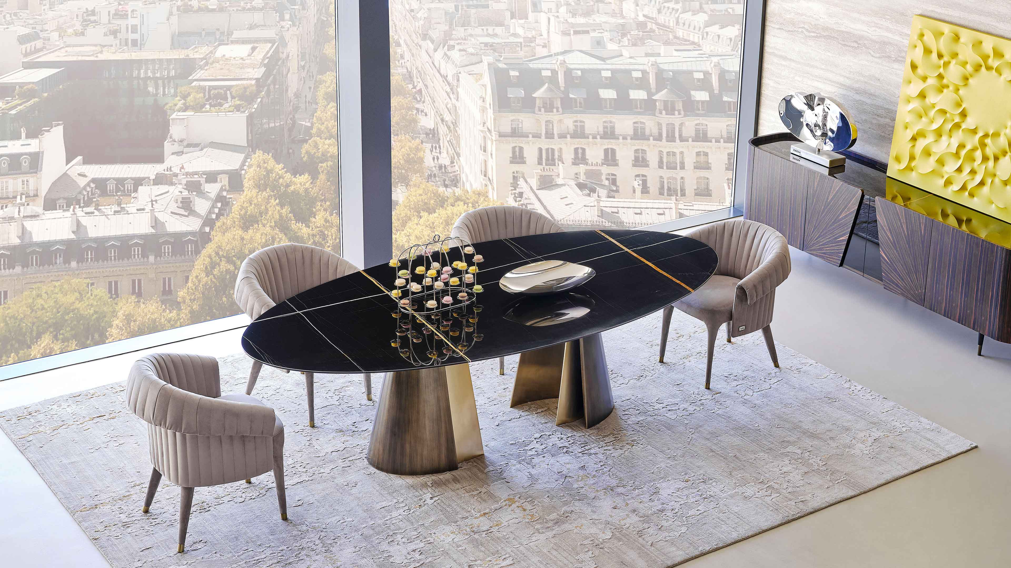 Dining Table with sculpturesque base characterised by the contrast between similar finishes, either bronze and gloss gold or black chrome and chromed steel. The top is available in a variety of dimensions and can be decorated or made out of wood or marble.