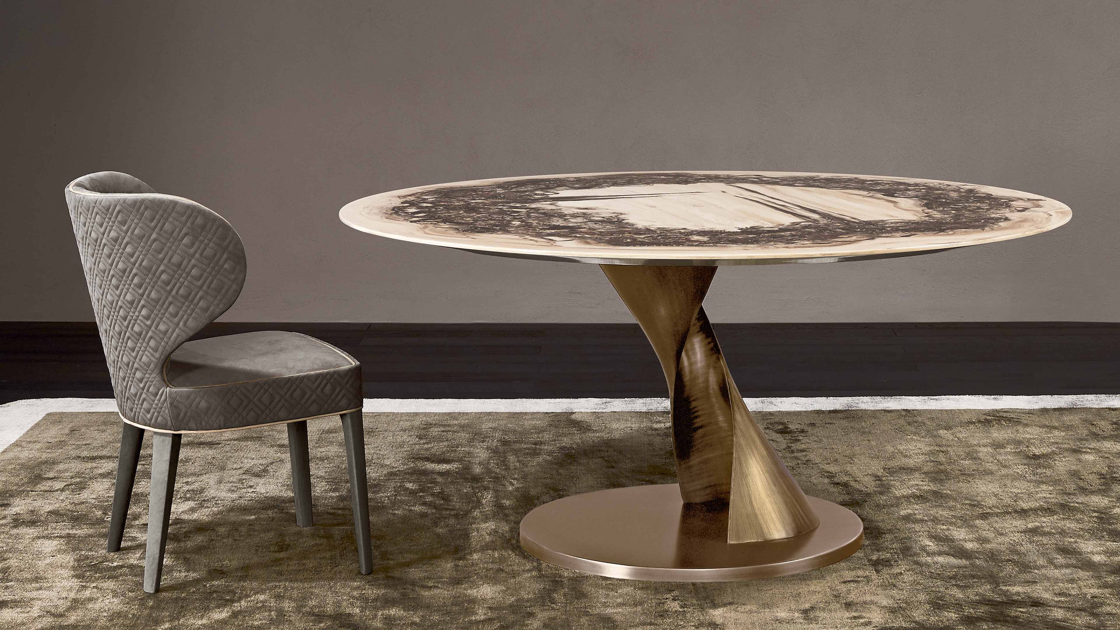 Elegant and sculpturesque dining table, base in bronze fusion. Top available in Natural Wood, with Hand-Painted finishes, upholstered in leather or marble.