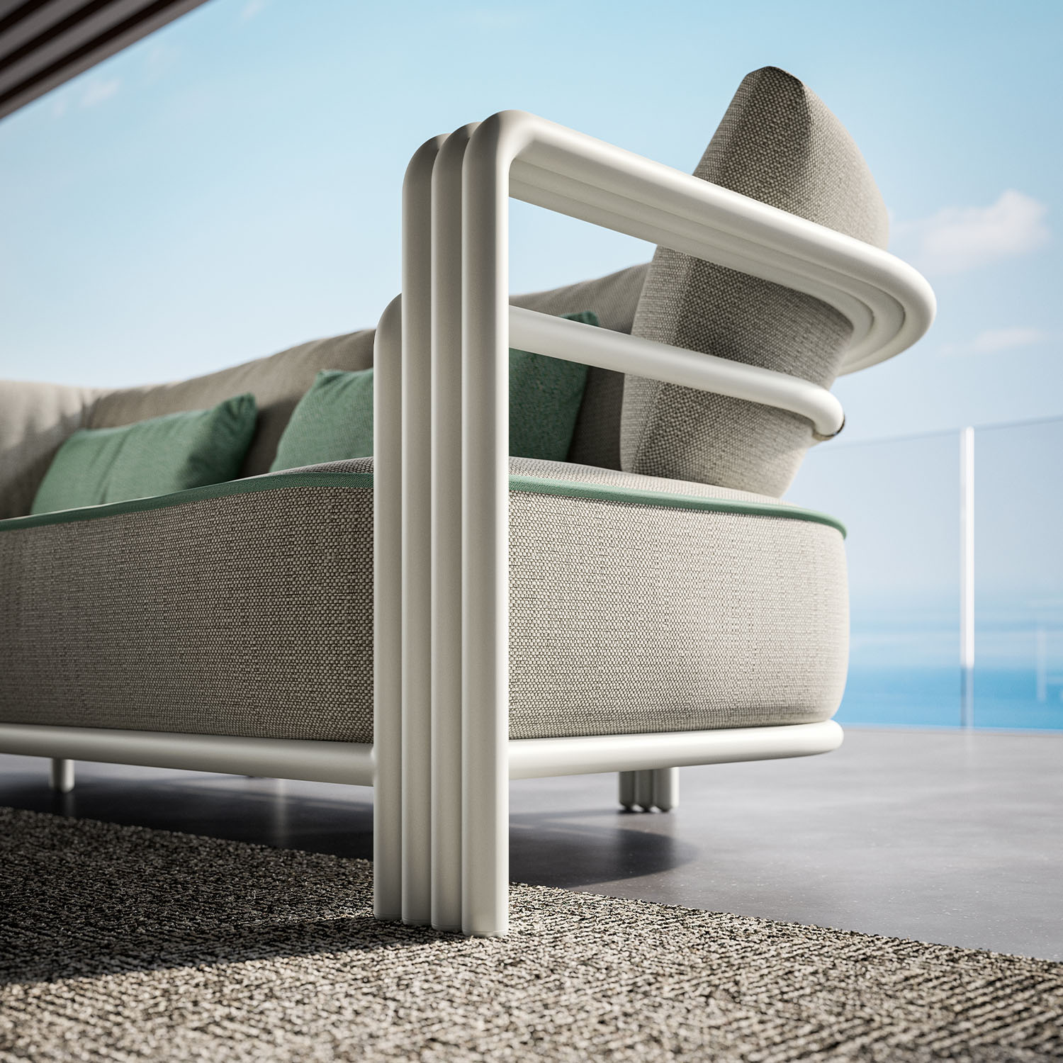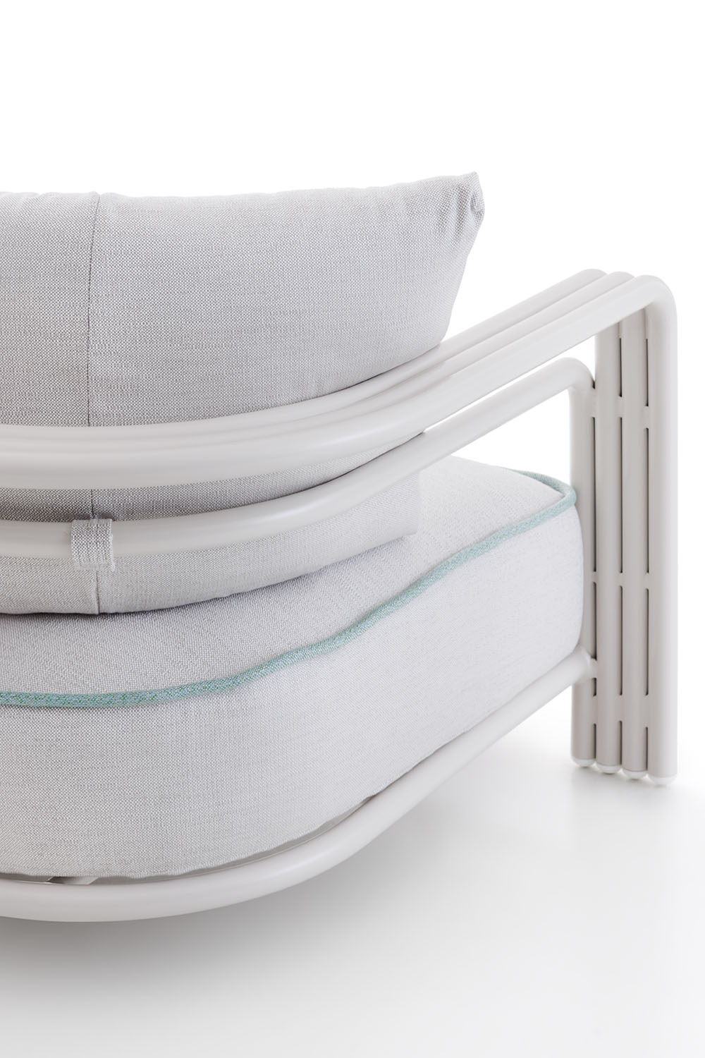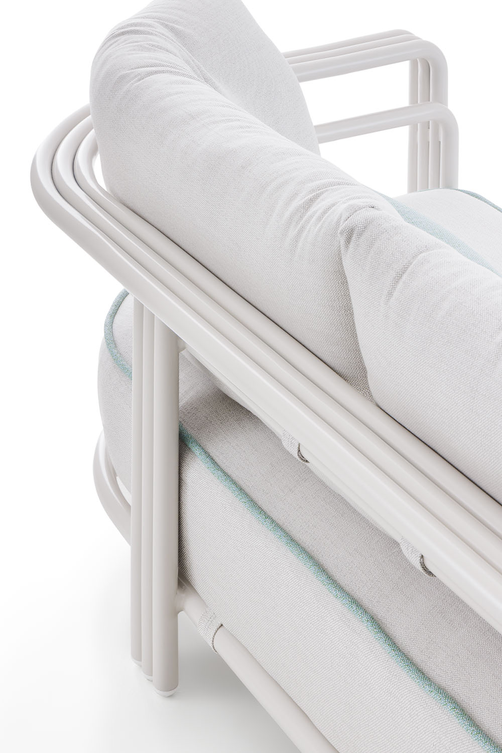 The design of the sofa and small armchair Capri has a distinctive and luxurious approach that turns out to be timeless. It is equal- ly comfortable indoor, on a covered terrace or outdoor to enjoy an afternoon. It complements with any space: city, countrys