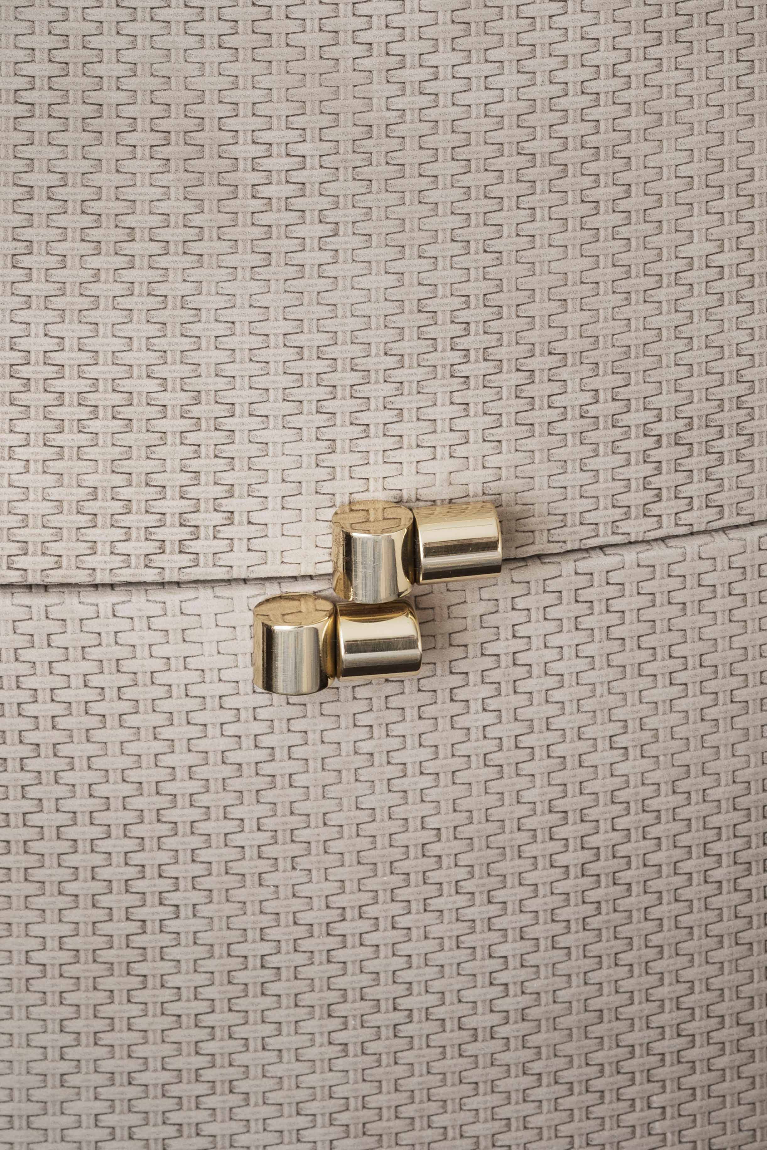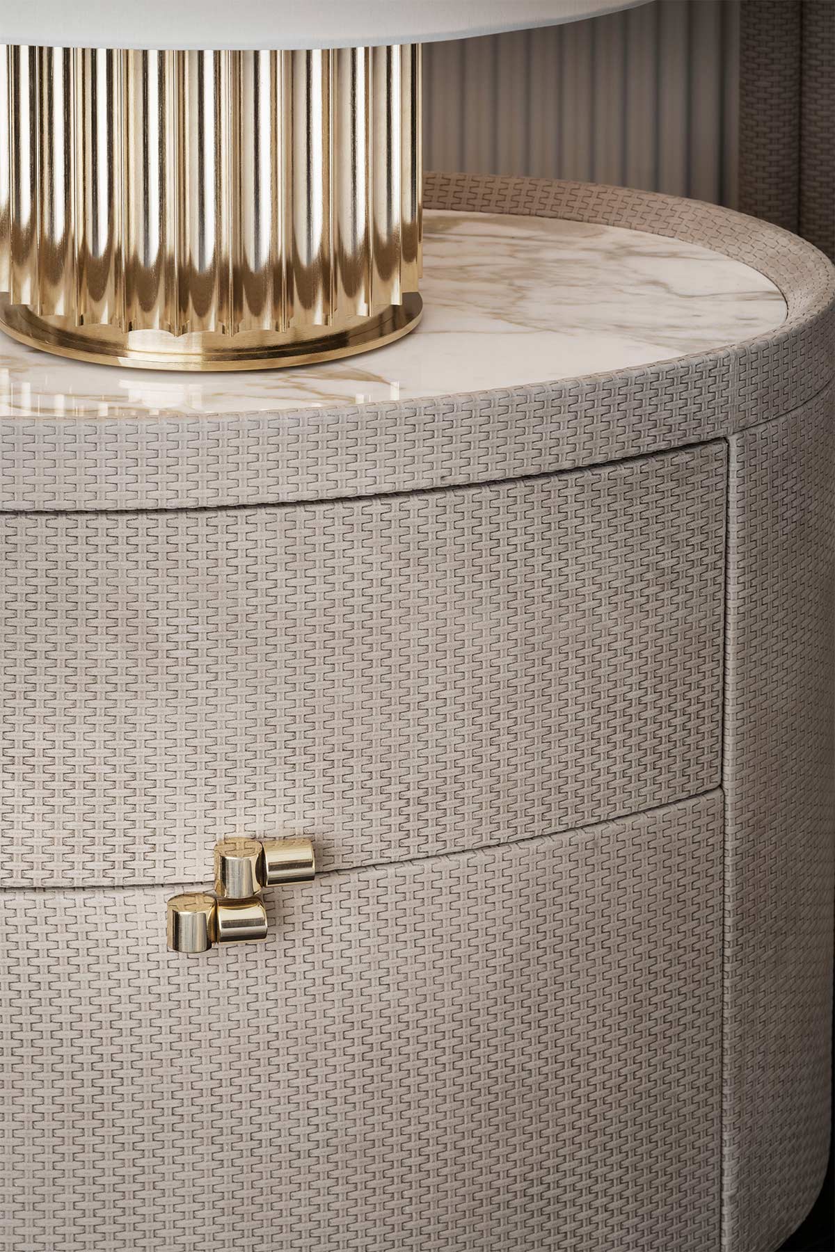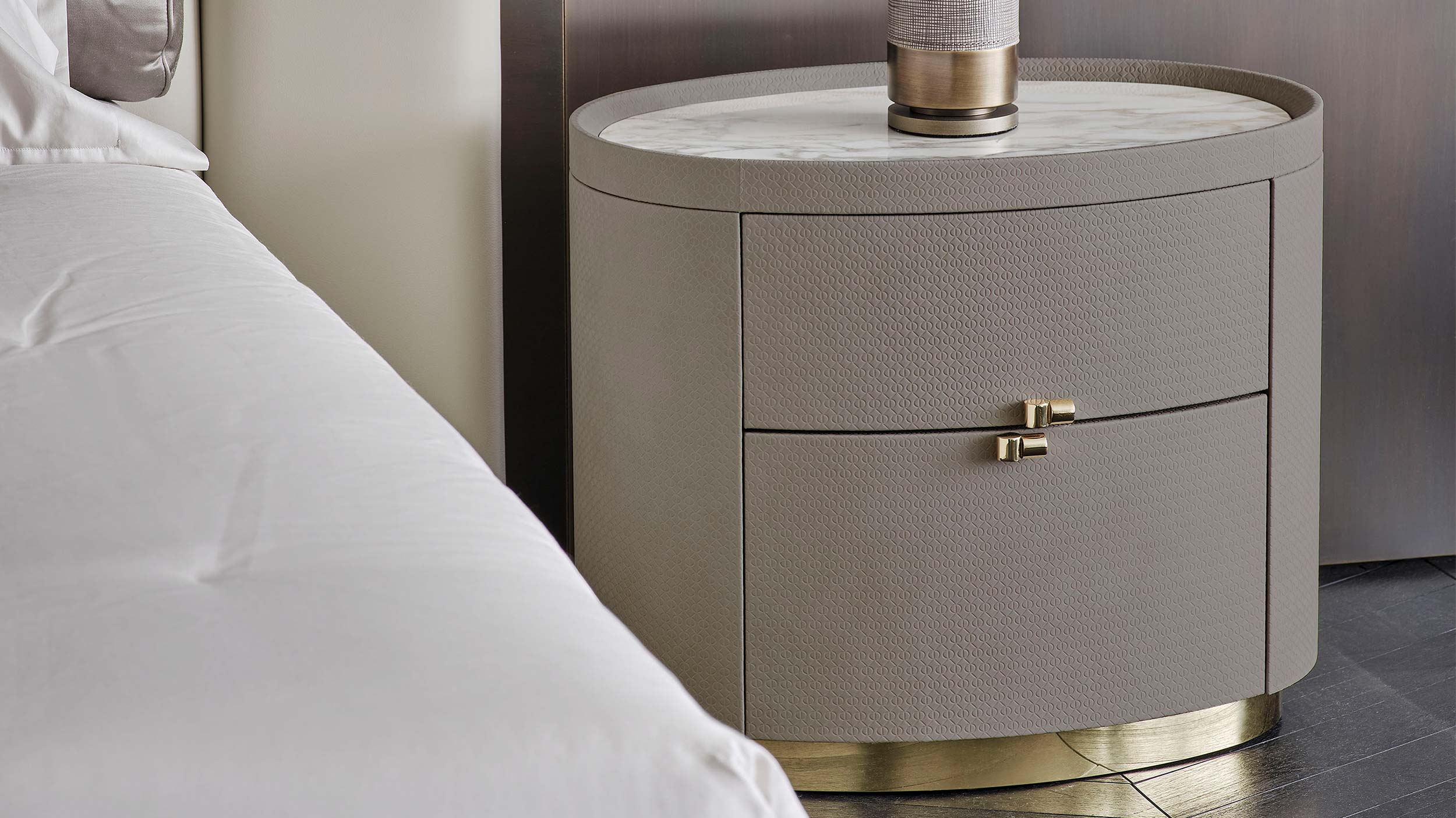 Comodino a 2 cassetti rivestito in pelle con piano in marmo e dettagli in ottone lucido.