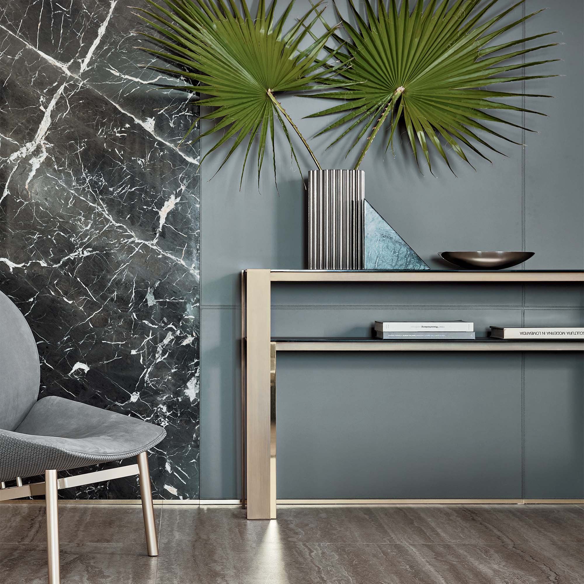 Linee essenziali compongono la console. Due piani in vetro incorniciati dalla struttura in bronzo.
