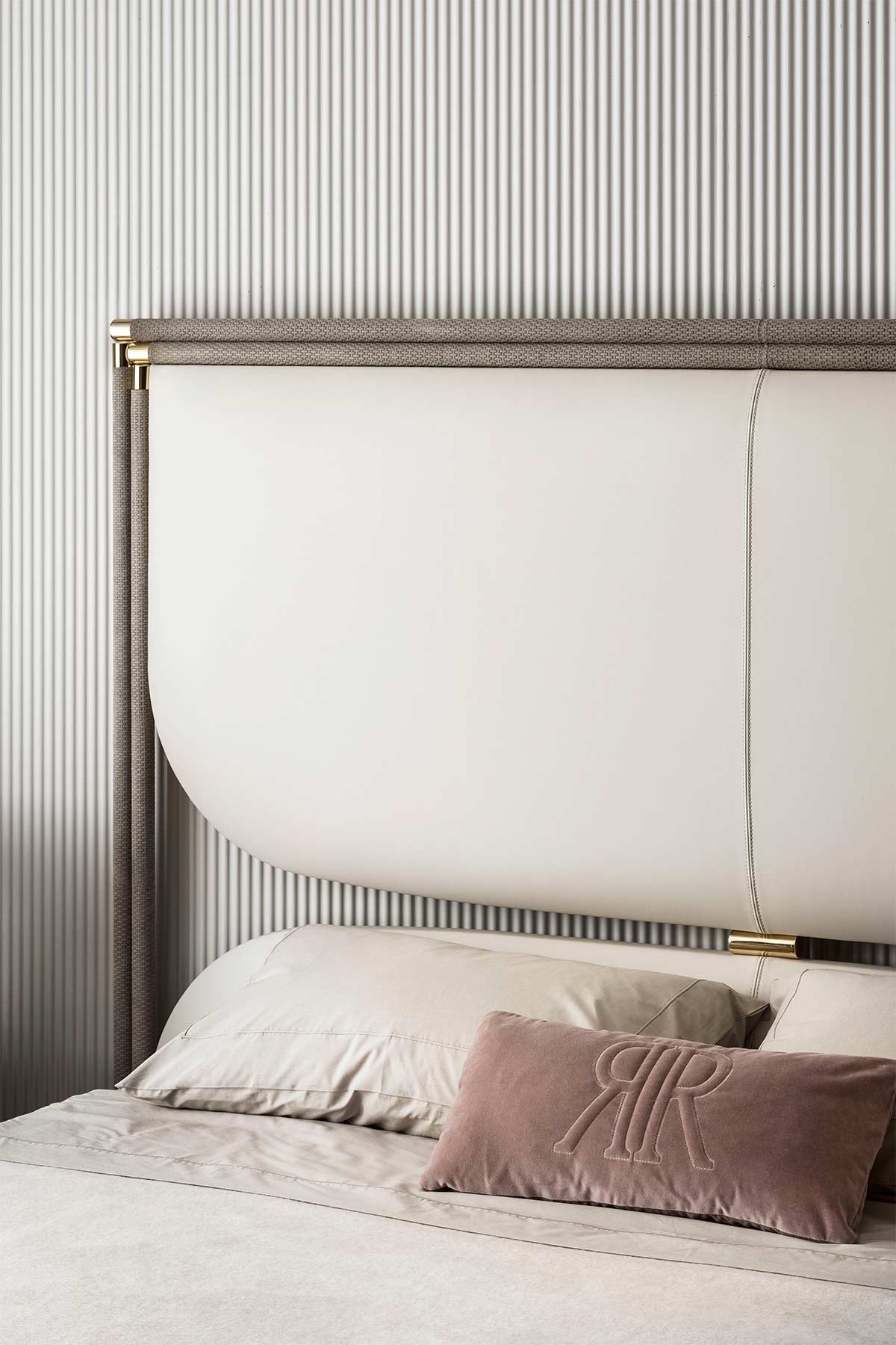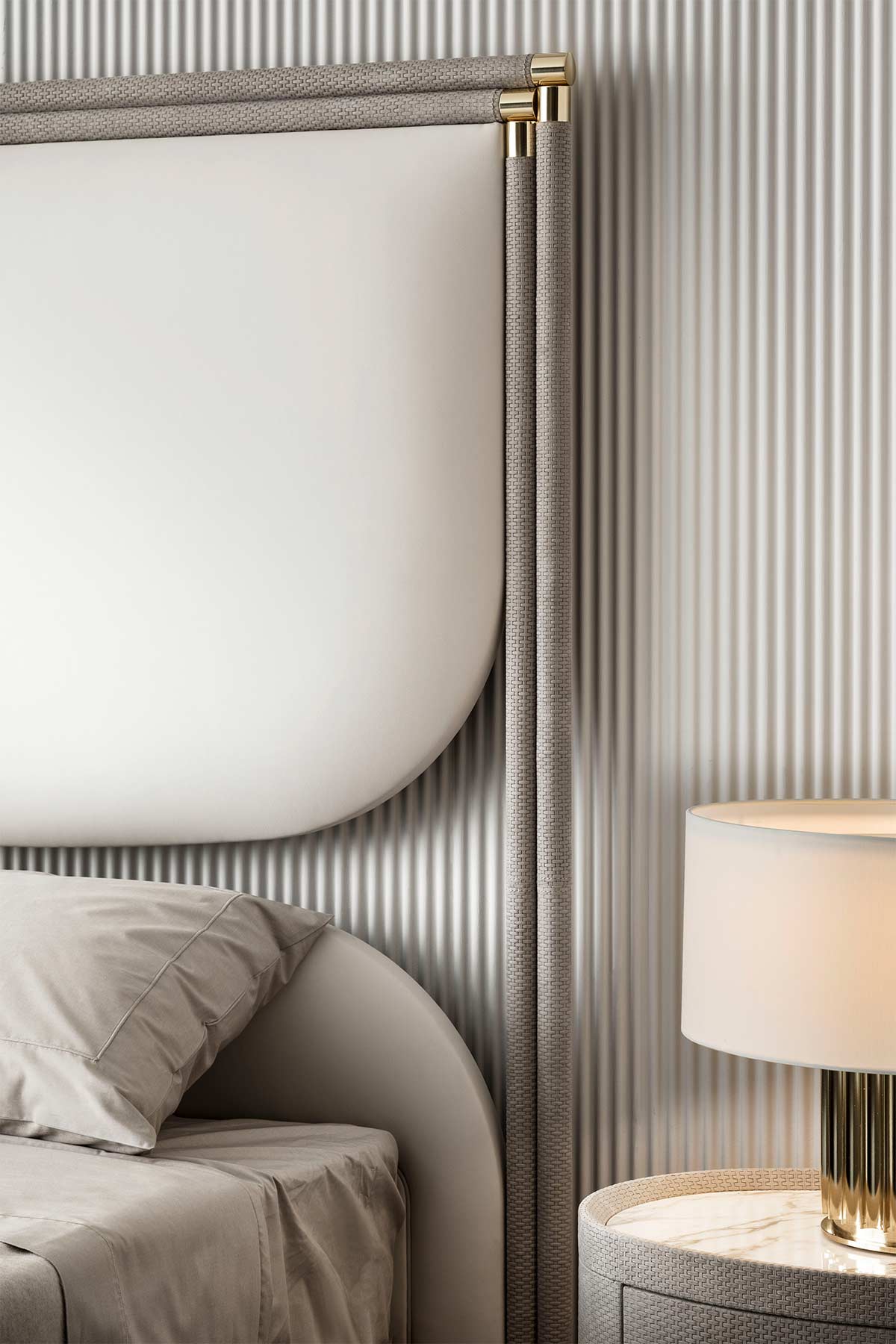 Testata imbottita con cornice in metallo rivestita in pelle liscia o stampata. Dettagli in ottone lucido o bronzo. Giroletto rivestito.