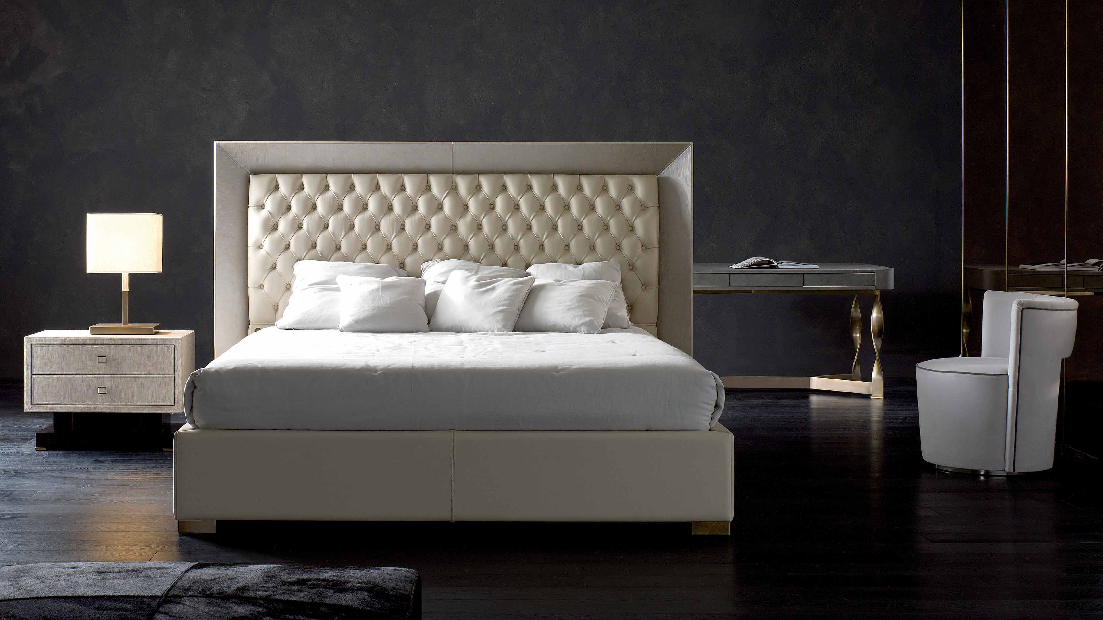 Testata lineare con cornice rivestita in pelle stampato o liscia, riempita con un’imbottitura rivestita in pelle lavorata capitonnè, che insieme al semplice giroletto dona immediatamente eleganza e ricercatezza.