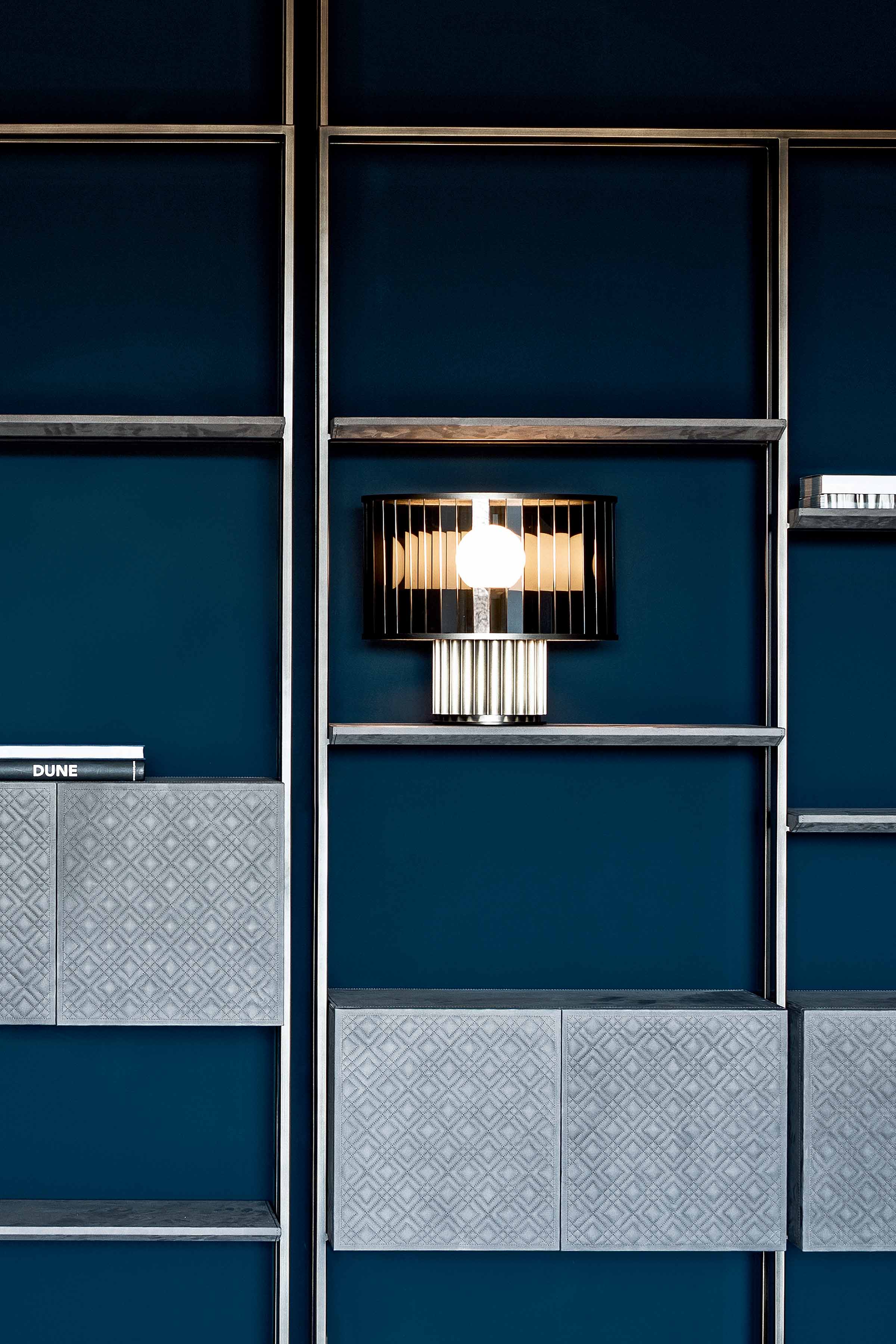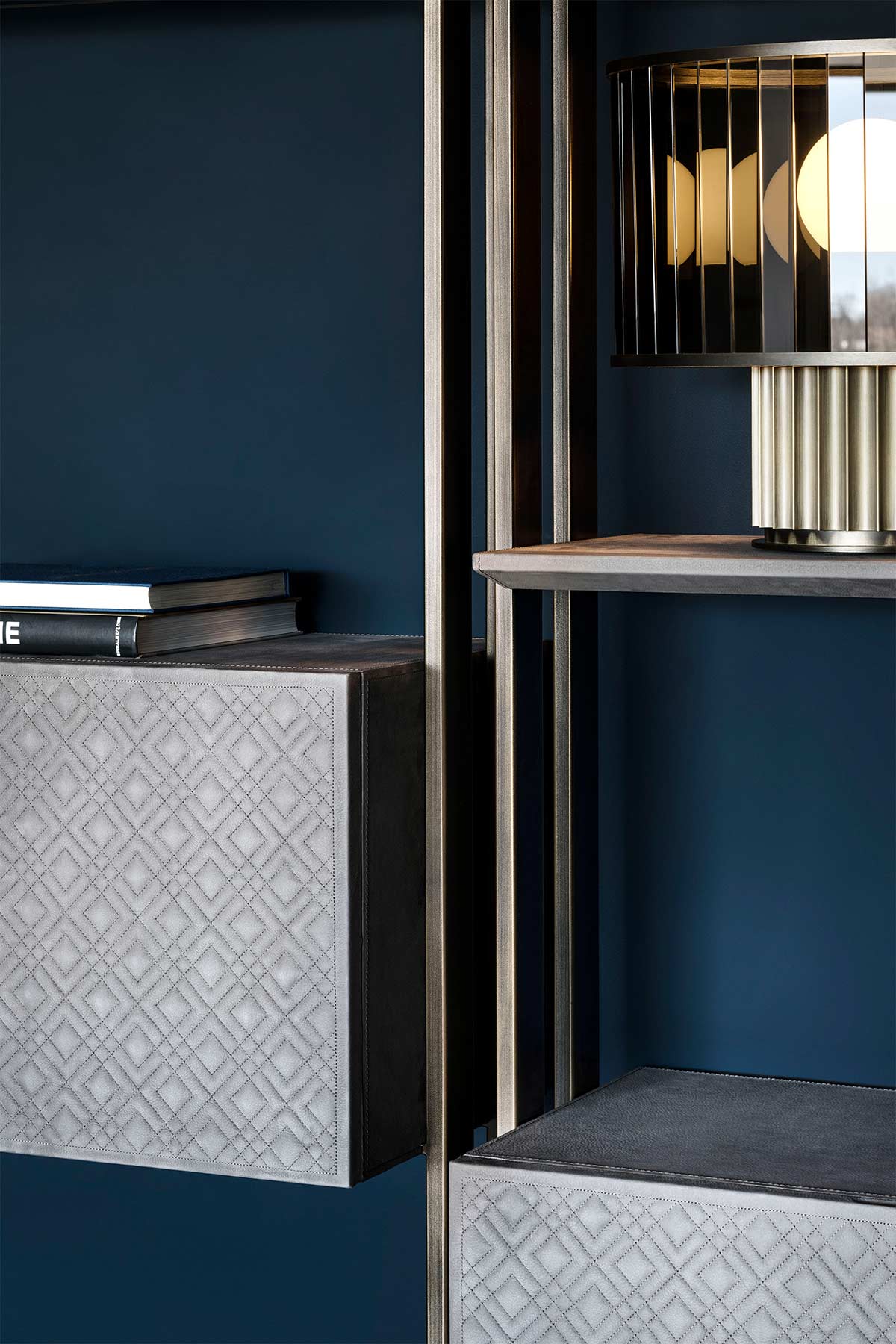 Librerie con montanti in bronzo verniciato o cromo nero, disponibili con quantità diverse di ripiani, rivestiti in pelle o in marmo e con l’aggiunta di box contetenitori anch’essi rivestiti in pelle con ante ricamate e con la possibilità di aver l’apertura
